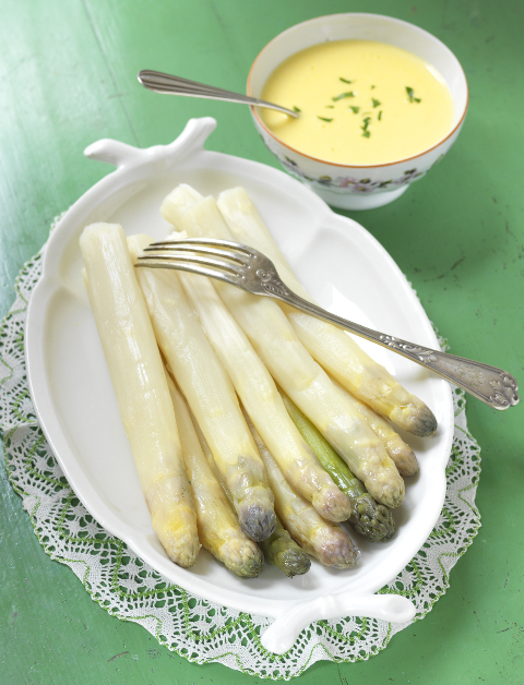 Die Sauce Hollandaise gleich zu dem Spargel servieren.